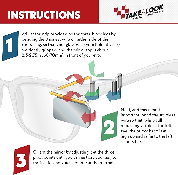 - ATTACHES TO SUNGLASSES OR HELMET VISOR - Our compact bike rear view mirror for cycling and other outdoor activities attaches to regular sunglasses or helmet visors to allow visibility of what's behind you without turning your head. The adjustable 3-pronged clip provides secure fit to your eyeglasses or helmet visor.