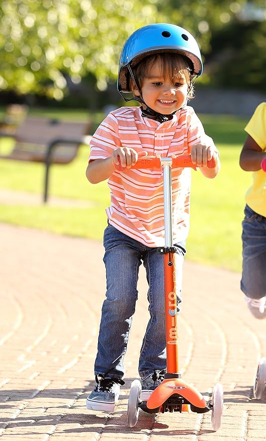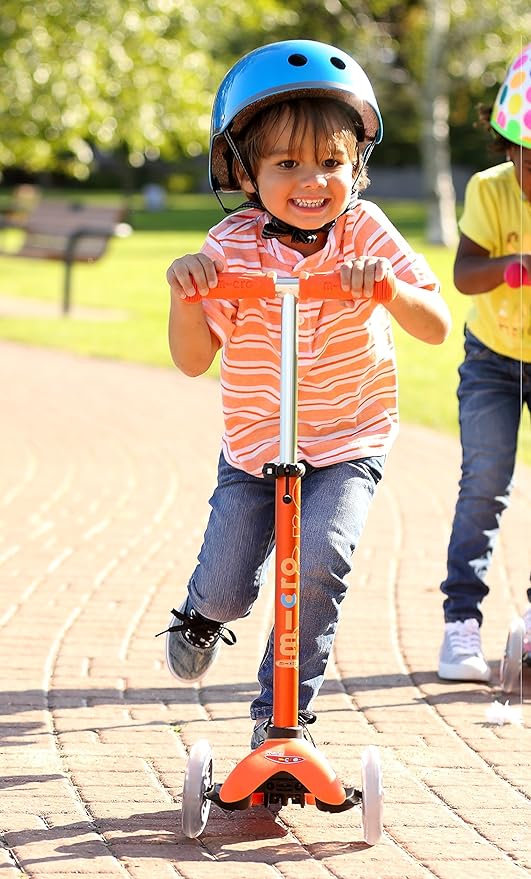 - Micro's 3-wheeled Mini Deluxe kickboard with Lean-To-Steer design, offers a stable ride that supports toddlers and small children as they master balance and coordination.
