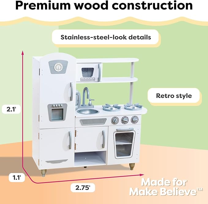 - HANDS-ON PLAY: Pick up the play phone and invite guests to dinner, press the ice maker, turn on the oven with the knobs that make a fun clicking sound—there's so much to do in this wooden play kitchen—just like the real thing.