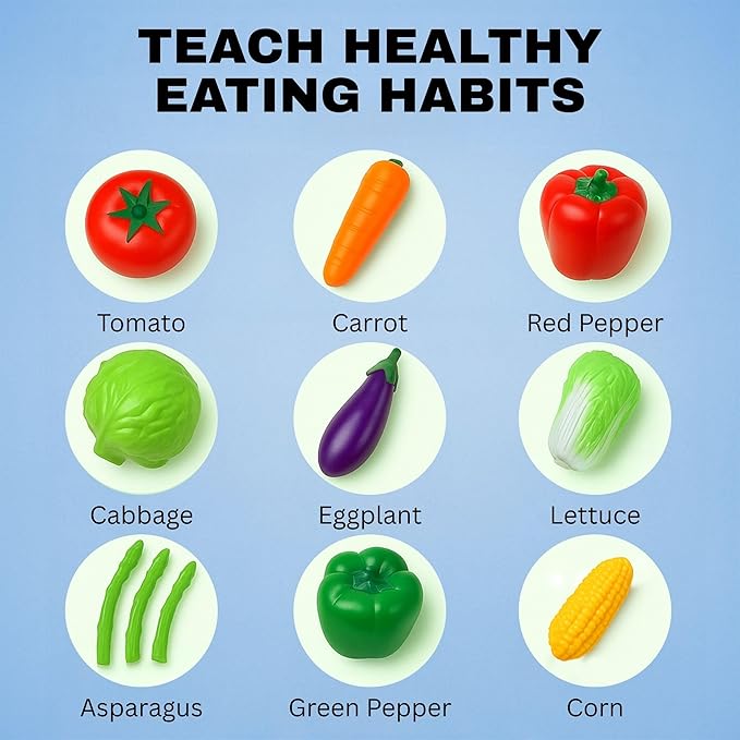 - 20 Piece Set: Includes red and green peppers, tomatoes, corn, asparagus, carrots, eggplants, cabbage, and lettuce – great for teaching healthy eating habits.