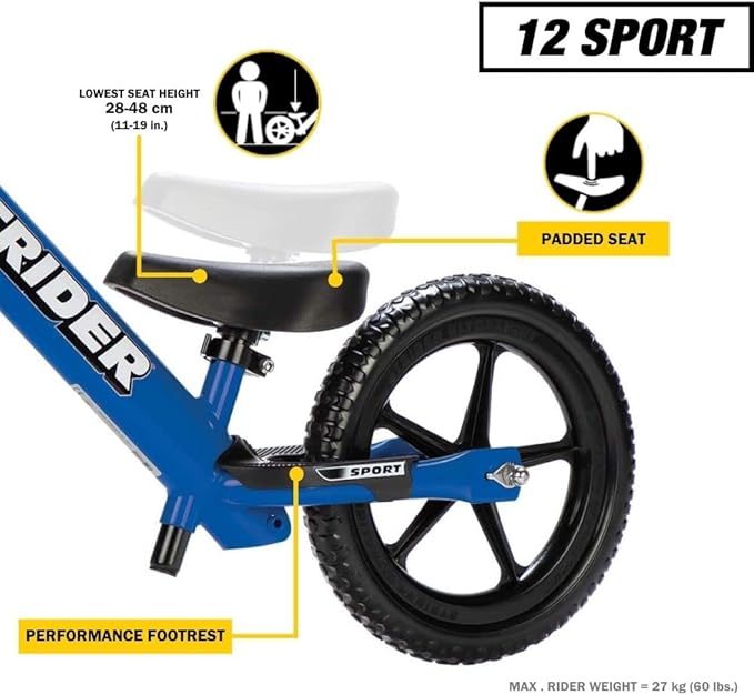 Strider 12” Sport Bike - No Pedal Balance Bicycle for Kids 1 to 4 Years - Includes Safety Pad, Padded Seat, Mini Grips & Flat-Free Tires - Tool-Free Assembly & Adjustments