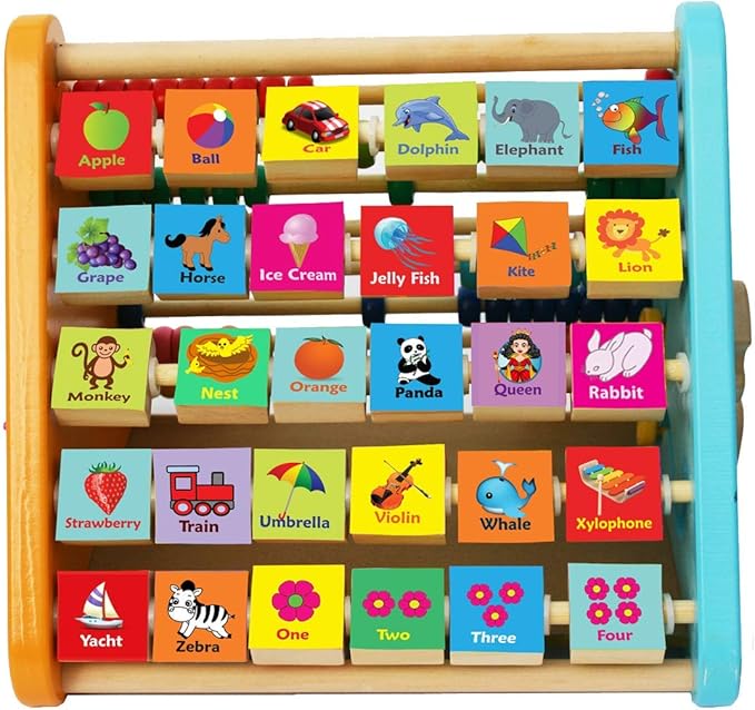- Multifunctional 5 in 1 wooden activity cube triangle: Flipping 26 alphabet blocks and four numbers blocks with pictures and English words, abacus, clock, zig zag sliding fish at 4 sides and white board at the bottom. One of the best wooden activity toys for toddlers