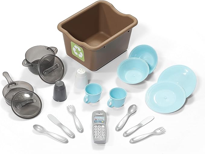- INTERACTIVE TOYS: Realistic lights and sounds, 20-piece toy kitchen play set, enhance playtime with pots, pans, silverware, storage bin, phone, (food and batteries not included)