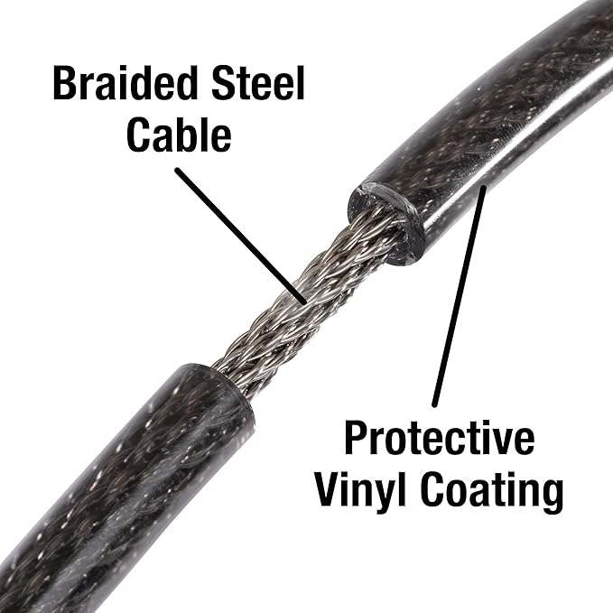- Bike lock is made with braided steel for strength and flexibility, and includes a protective vinyl coating that helps prevent scratching