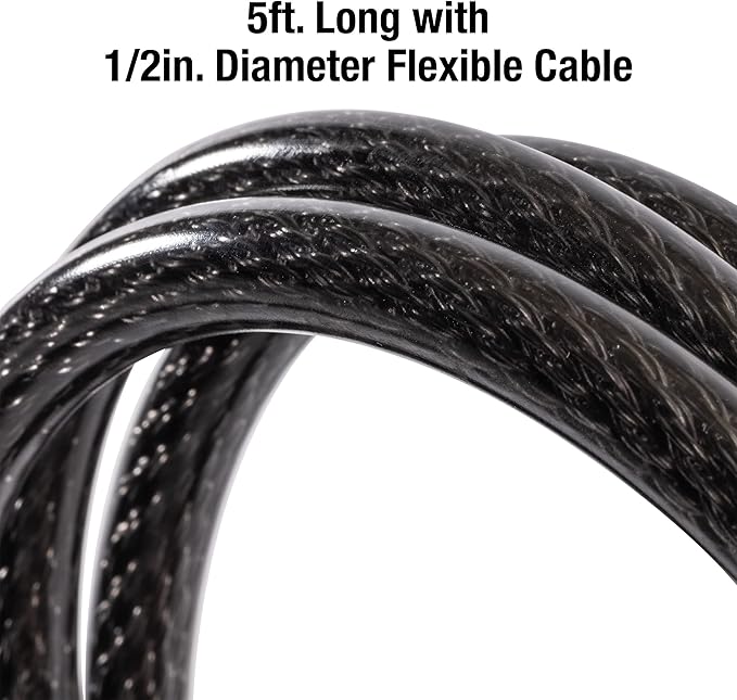- Bike lock cable is 5 ft (1.5 m) long and 1/2 in. (12 mm) wide in diameter