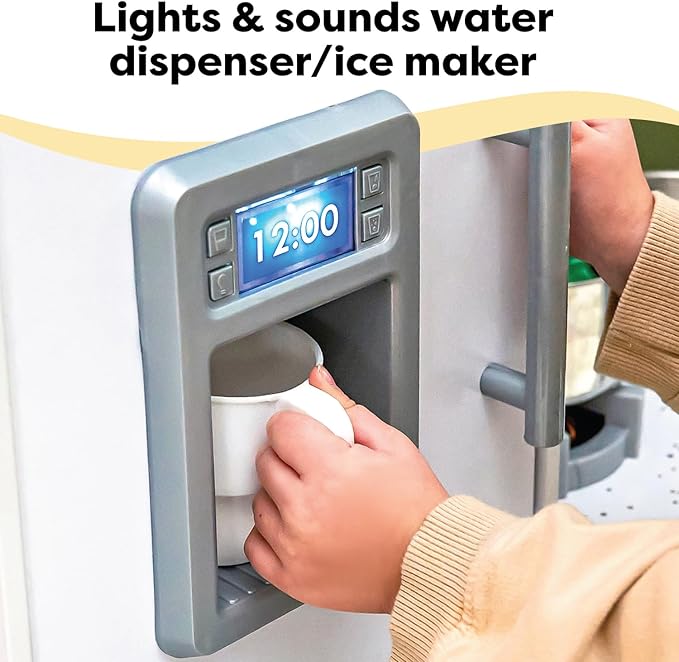- LIGHTS and SOUNDS: The burners light up and make cooking sounds; water dispenser also lights up and makes realistic sounds when pressed.
