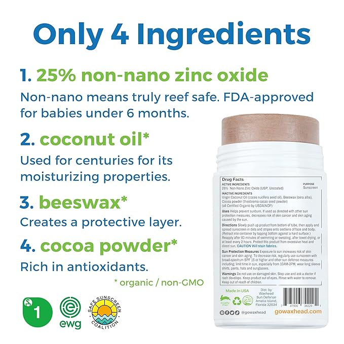 - 4 food-grade ingredients in this non toxic sunscreen and reef safe sunscreen SPF 30. This tinted mineral sunscreen face stick, coral reef friendly sunscreen stick is a true non nano zinc oxide sunscreen. NO petrochemicals at all. Great sport sunscreen and kids sunscreen stick. The perfect biodegradable sunscreen for coral reef safe sunscreen and sensitive skin!