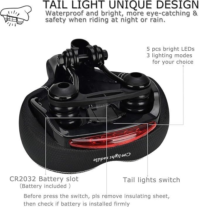 - Built-In Waterproof Bright Taillight for Safety - Enhance your visibility & safety with our unique tail light design. The DAWAY C99 comfy bicycle seat features 5 super bright LEDs powered by 1 pcs included CR2032 battery, offering up to 36 hours of use in "steady" mode. With 3 different lighting modes, you can customize your visibility to ensure optimal safety during night rides or in rainy day. This built-in taillight saves you the hassle & expense of buying and installing a new taillight