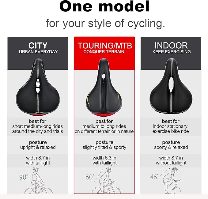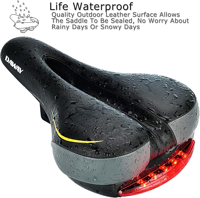 - Built-In Bright Waterproof Taillight for Safety - Stay visible and safe with our built-in waterproof tail light. The DAWAY C66 soft bicycle seat includes 5 bright LEDs powered by 1 pcs CR2032 battery (included), offering up to 36 hours of visibility in "steady" mode. With 3 different lighting modes, you can customize your visibility to ensure optimal safety during night rides or in rainy day. This built-in taillight saves you the hassle & expense of buying and installing a new taillight