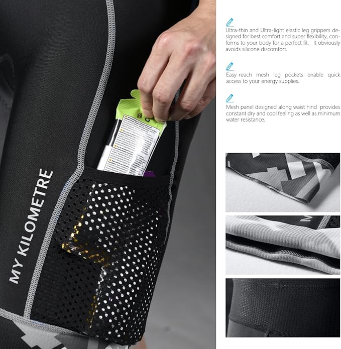 - Accessible Storage Pockets on Sides: Nutrition storage pockets on each side of the legs for easy access whilst on the bike or run.