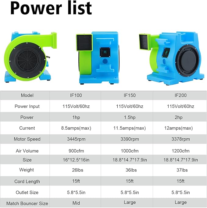- Versatile and Convenient: The 15ft long 14awg power cord provides ample length to reach power sources without the need for extension cords, offering you the flexibility to set up your bounce house wherever you desire. Its stackable design allows you to connect up to 3 units together, making it perfect for larger inflatables or multiple bounce houses.