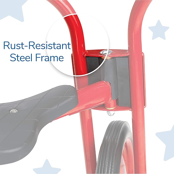 - DURABLE & SAFE: Each trike's steel frame has a red, powder-coated finish designed to resist rust. Safety features include: hidden (non-exposed) pedal hardware, solid rubber tires on spokeless steel wheels, and a no-pinch, recessed hub.