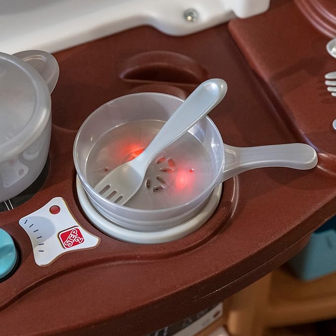- INTERACTIVE TOYS: Lights and sounds, 25-piece toy kitchen play set, enhance playtime with pots, pans, silverware, coffee pot (food and batteries not included)