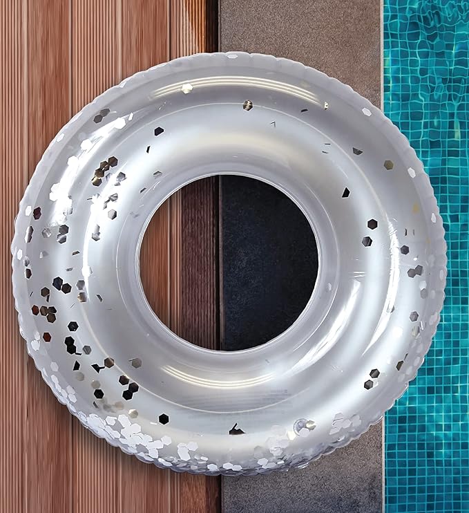 - THE SILVER POOL INFLATABLE RING IS FOR ANYONE WHO LOVES TO LOUNGE IN STYLE - Looking to decorate an outdoor space for a beach-themed party? The stylish pool floatation ring is a must have on summer wish list you cannot do without. Cool Silver ring inflatable float filled with silver sparkly confetti makes a magical time under the sun. The perfect pool party backdrop and summer floats for adults and kids looking to make a splash.