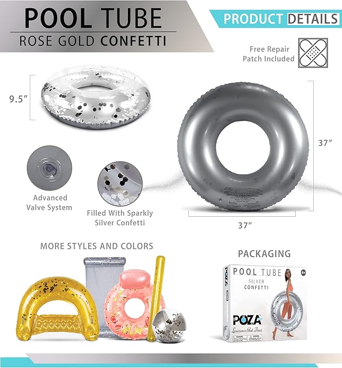 - INCLUDED WITH THE PURCHASE OF SILVER POOL LOUNGE FLOAT - Includes 1 POZA Silver Pool Float for kids and adults filled with silver confetti designed with a silver color. Use an electric air pump with our advanced quick air valve system to easily inflate or deflate the pool float glitter tube. The inflatable tube float ring for kids and adults measures 36Lx36Wx9.5H inches and includes a repair patch. Tubes recommended for ages 4 and up.