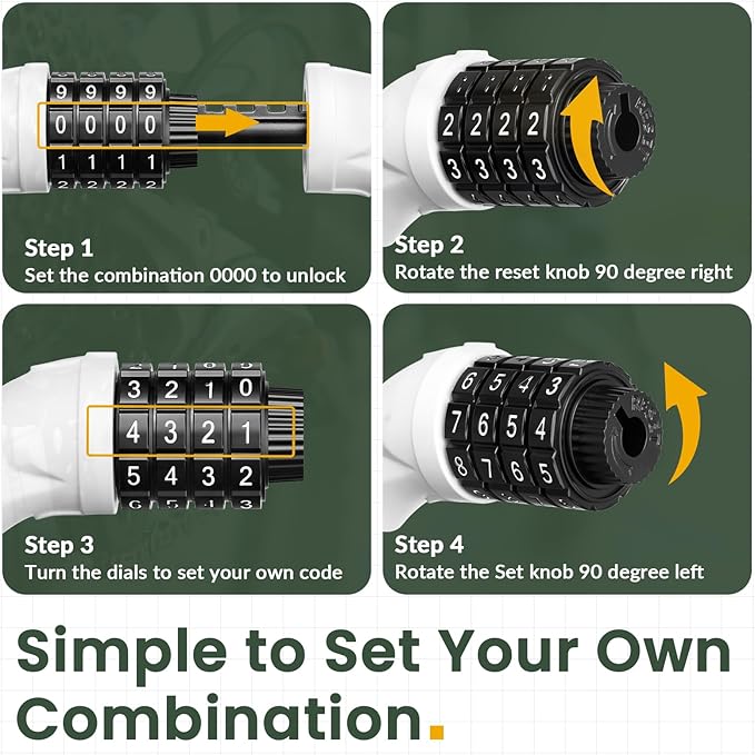 - Resettable combination bike lock: Smart 4-digit resettable coiling lock, easy to set your own personalized combinations. As a kind of combination lock, it saves you a lots of unnecessary troubles, like carrying the keys all the time.
