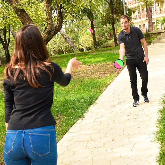 - Easy to use: self-stick front surface of each paddle, toss the ball, the ball sticks really well to the paddle, adjustable hand strap works well for small or large hands.