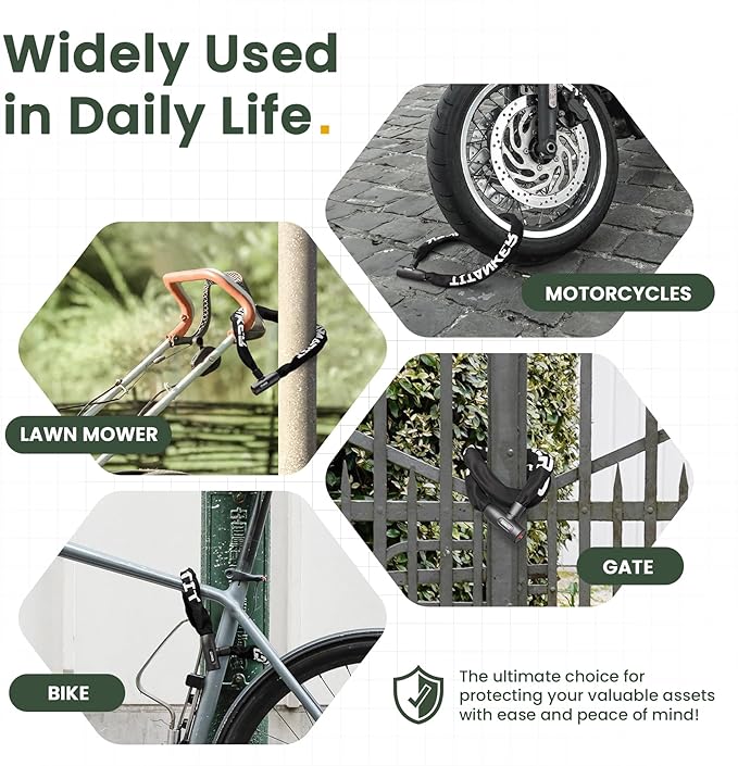 - 3ft chain lock for bike: With 6mm thick security heavy-duty chain links, our bike chain lock is made of heavy-duty steel known for its cut-resistance. Regular lubrication for the lock hole and keyhole will prolong the lock’s service time.