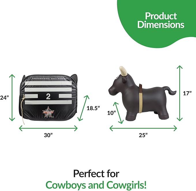 - SAFE & DURABLE FOR AGES 18 MONTHS TO 3+ YEARS: Carefully crafted with heavy duty rubber, our toddler ride on toys can withstand both the rough indoor and outdoor of little cowboys and cowgirls. The Lil’ Bucker bull toddler bouncer set includes a pop-up PBR bull riding chute, bull rope, dual-action hand pump, and instructions for easy assembly.