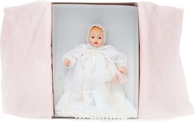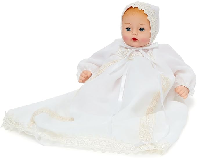 - Details: This beautiful baby doll wears a baptismal gown and bonnet made of white chiffon and lined with white taffeta; Features lace accents and white satin ribbon trims; White taffeta bloomers and white socks