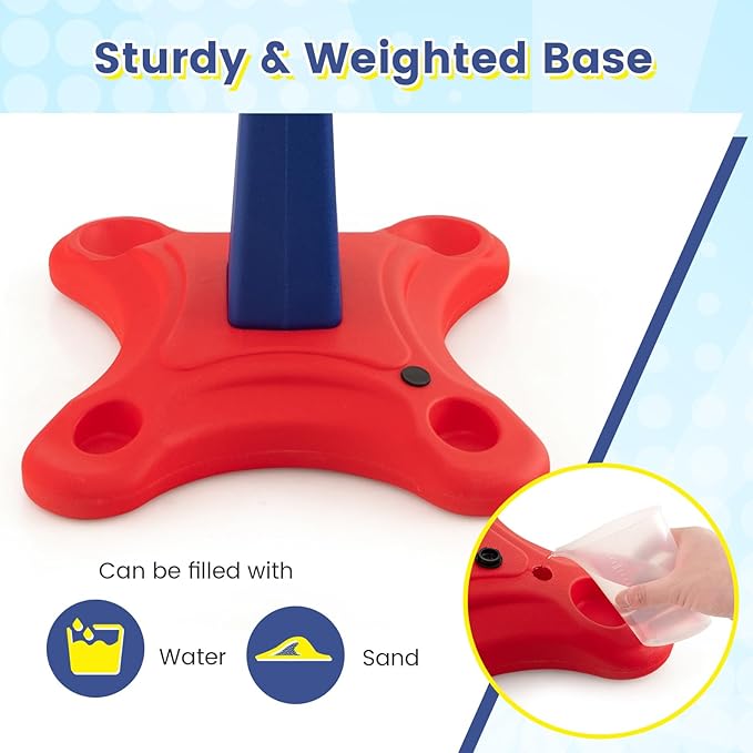 - 【Safe Material & Stable Base】 Made of premium HDPE and with ASTM certification, this basketball hoop stand is non-toxic, odorless and durable. The thickened pole and wide base ensures great safety and stability when playing competitive games. And there is a hole for you to fill the base with water or sand to increase stability.
