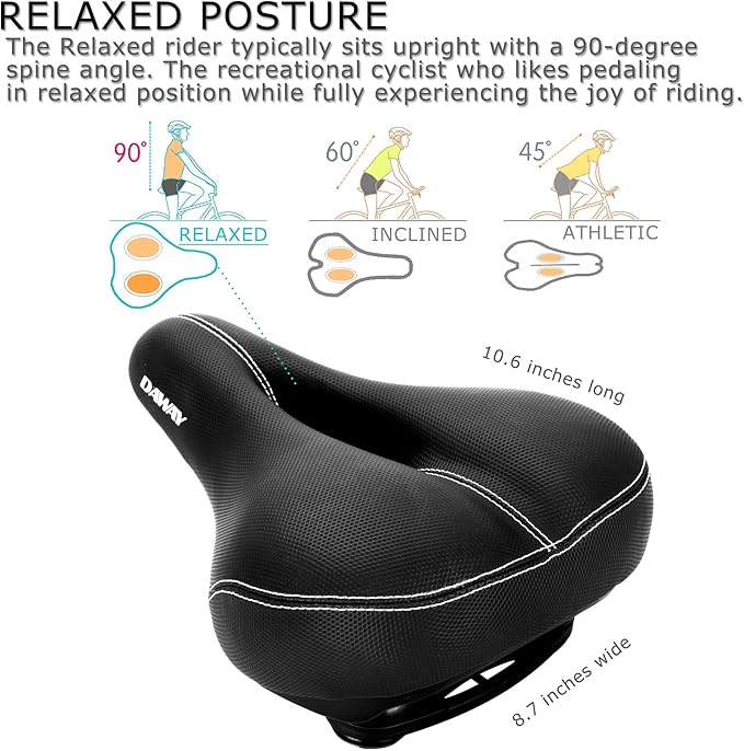 - Ultimate Comfort with Soft Foam Padding - Say goodbye to discomfort with the DAWAY C10 comfy bike seat, designed for ultimate comfort. Padded with thicken, widened, high-density memory foam and covered in waterproof PVC leather, this soft bike saddle provides excellent cushioning, reducing pressure on sensitive areas and effectively relieving back strain. Ride longer and enjoy the journey without any pain or discomfort, ensuring the best protection for your hips and spine