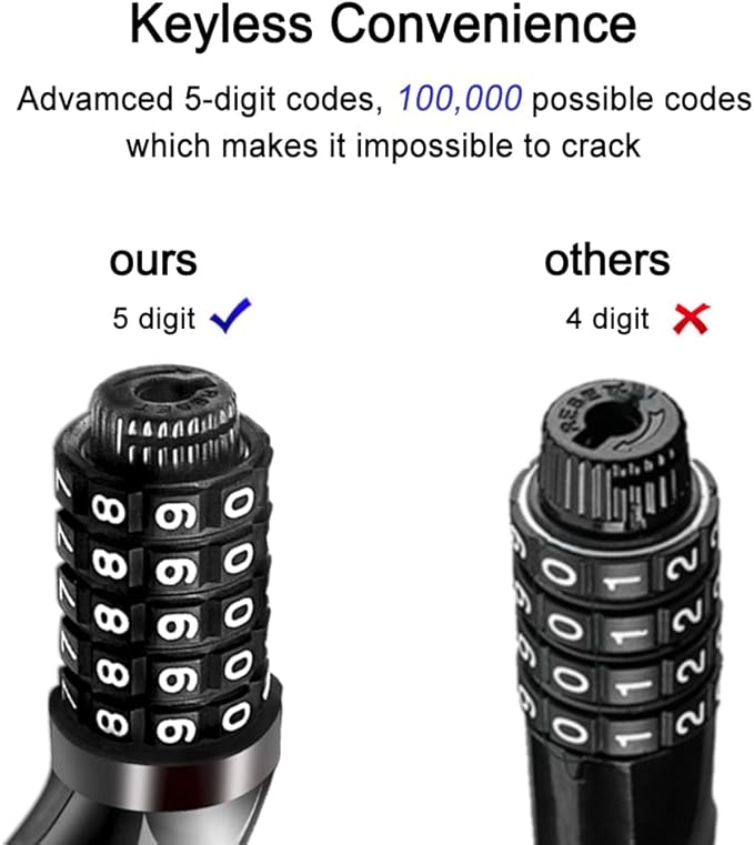 - SECURE & RESETTABLE: NDakter bike locks with 4FT long cable (distance between ends of lock), and this bike lock is 5-digit resettable combination cable bike lock, much safer than other 4 digit bicycle lock. Easy to set your own personalized number combination.(Safety tip: Please do not leave your bike out of your sight for too long, especially in high crime areas.)