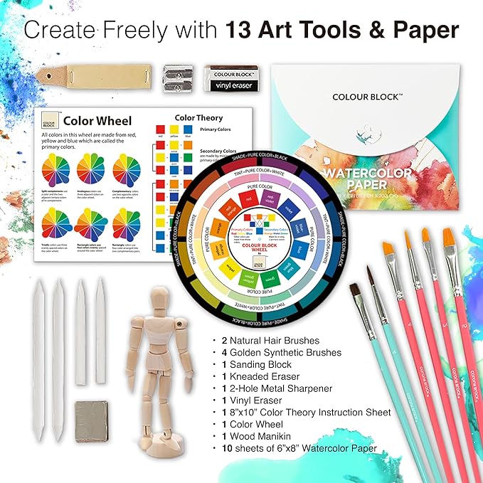 - Complete with handy art tools: sanding block, blending stumps, kneaded eraser, vinyl eraser, 2-hole pencil sharpener, 10 sheets of 6” x 8” watercolor paper, 4 golden synthetic brushes, and 2 natural hair brushes. bonus educational inspiration with a 5 ½” wood manikin, a color wheel that teaches mixing and definitions, and a color theory sheet in 3 languages.
