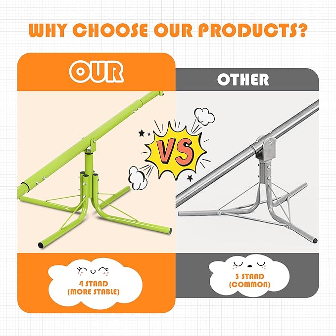 - Durable & Comfortable: This playground is made with heavy-duty frame that’s ensured to carry 150 lbs (per each side), weather-resistant powder coat finish for added durability and protection against corrosion and rust;Large, elongated, and padded seats for a comfortable ride