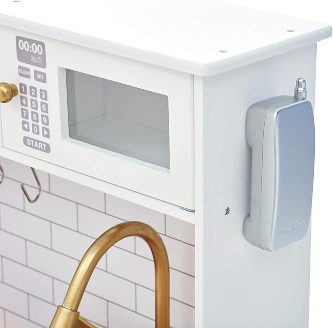 Teamson Kids Little Chef Boston Compact Farmhouse Interactive Wooden Play Kitchen with Sink, Oven, Microwave and Storage Space for Easy Clean Up, White with Gold Finishes