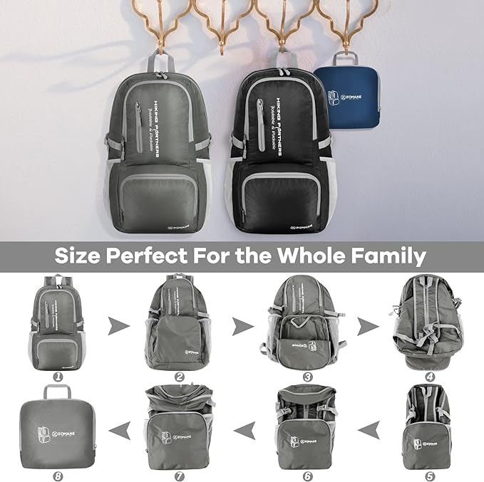 - LARGE CAPACITY LIGHTWEIGHT FOLDABLE BACKPACK 35L: Our foldable hiking backpack capacity is 35L,with large capacity and many pockets.There is a main bag in the foldable daypack,and there are compartments in the main bag,which can be installed and clothes and washing products;There are 3 front bags that can store mobile small equipment.Two side bags store water bottles and umbrellas.There are protective buckle bands from the side bag to avoid the drop of umbrellas and water bottles