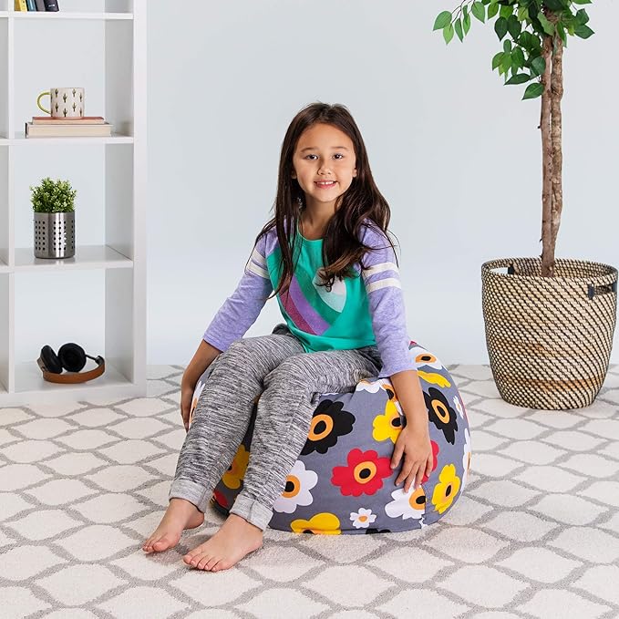 Posh Stuffable Kids Stuffed Animal Storage Bean Bag Chair Cover - Childrens Toy Organizer, Medium 27" - Canvas Multicolored Flowers on Gray