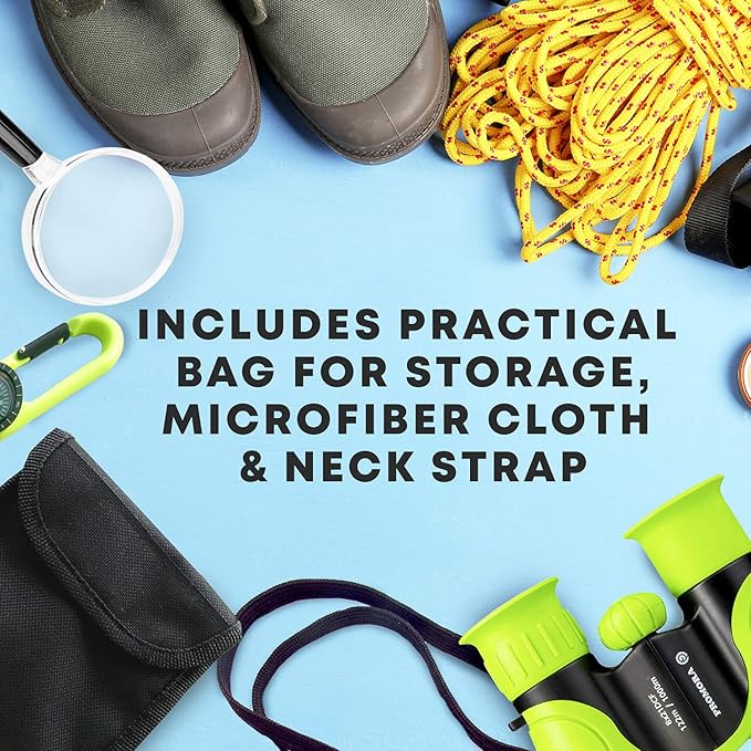- ADVENTURE ACCESSORIES: These exciting binoculars come with a real compass and magnifying glass to encourage small kids to have adventures; Includes a practical cloth bag for storage, a microfiber cloth to clean the glasses, and a neck strap to secure the binoculars