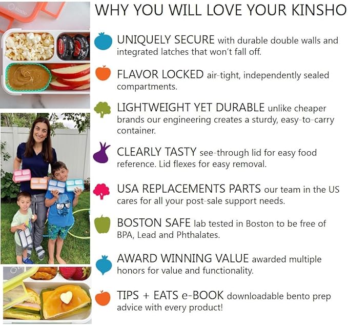 - KIDS AND ADULTS LOVE KINSHO for the individually sealed compartments that keeps food from touching. The modern grid design and clean white container bottom makes all food look tasty. Designed with a slim depth, the lid will be an air-tight fit to keep food fresh and not jostle around but is NOT recommended for liquid, soup, juice, etc.