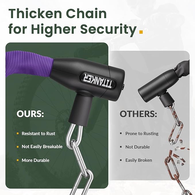- Heavy Duty & High Quality: With 6mm thicker security heavy-duty chain links, our bike lock is made of heavy-duty steel known for its cut-resistance. Lubricate the bike chain lock hole and keyhole regularly, this will prolong the lock's service time
