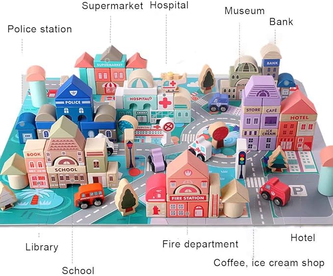- NATURAL WOODEN TOY : This toddler Building blocks toy is made of high quality wood, BPA Free and stained with bright non-toxic water-based paint,sanded smooth, and finished with safe, manufactured to the highest grade. The blocks are easy for your kids to grasp, perfect for your children to stacking various of buildings. such as hospital, hotel, police station, bank, store.