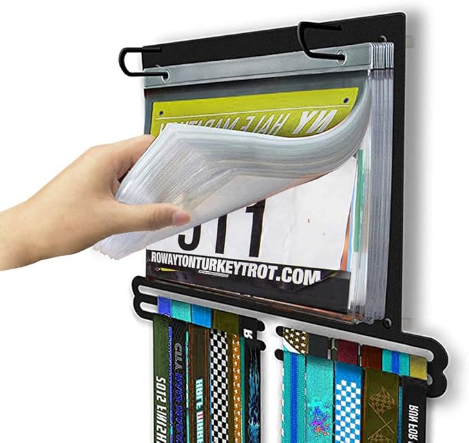 - HOLDS UP TO 60+ MEDALS - Measuring 14" W x 11" H, double hang-up designed for 60+ medals, this medal display is a must own for all athletic competitors and race enthusiast! 20 PCS vinyl sleeve, holds more up to 100 bibs or photos, they are stretchable, soft, washable and reusable