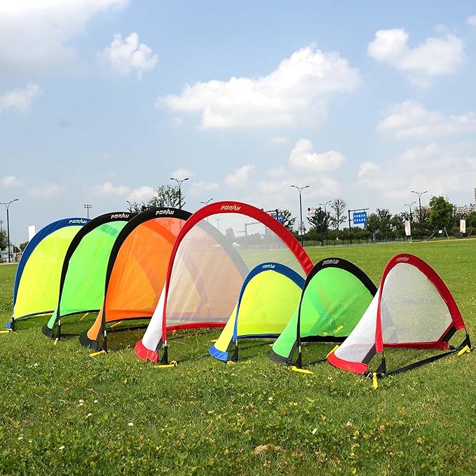 - ✔️POP UP DESIGN & 4FT LARGE SIZE - Pair of pop up soccer goals are ideal for all levels of play and training. The simple one piece twist and pop up design ensure you’re playing in seconds, and pack away is just as quick. This size is enough for you and your team to do football training or competition. The open size is 47.6" L x 31.8" W x 31.8" H
