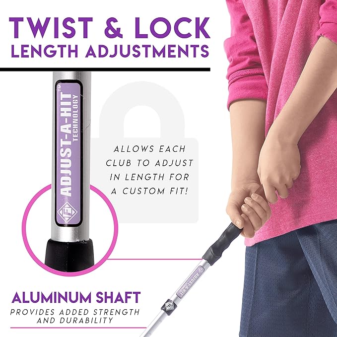 - Easy twist & lock length adjustments: each Club features our adjust-a-sport technology, which allows each Club to adjust in length for a custom fit, promoting proper swing technique for each player!