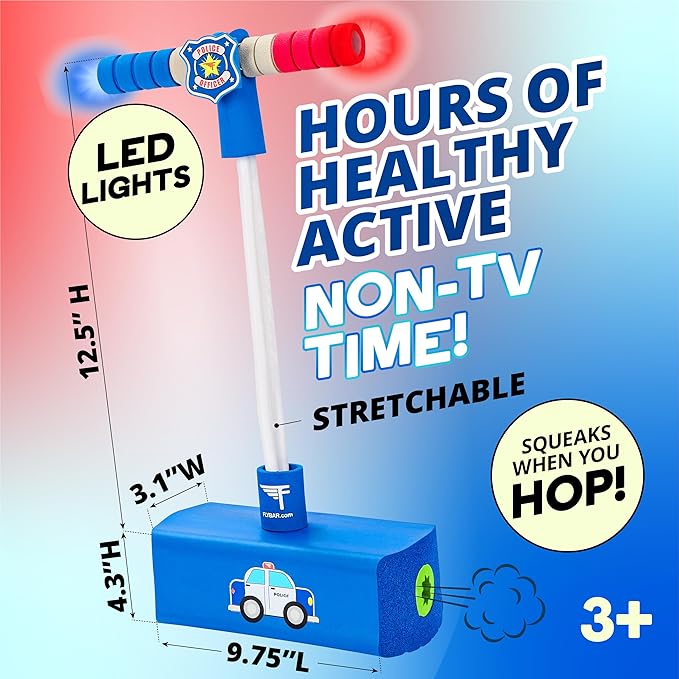 - Boing, sirens, lights! The My First Flybar foam pogo stick is hours of healthy, bouncy fun, an ideal first pogo stick for kids! Siren sounds play with each jump your little police officer makes