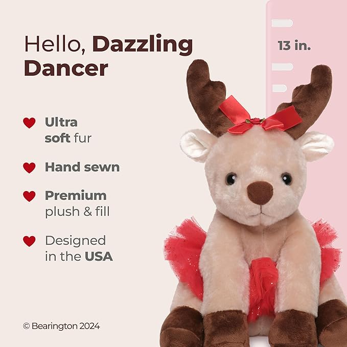 Bearington Dazzling Dancer Ballerina Doll Plush, 13 Inch Reindeer Stuffed Animal, Ideal Christmas Dolls for Girls Gift for Toddlers, Kids & Teen, for Ages 3-14