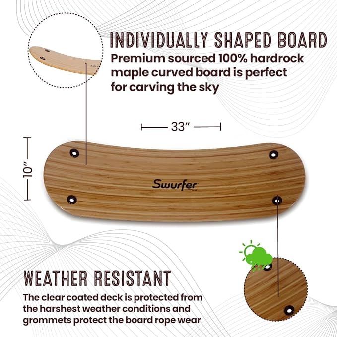 - Sustainable Bamboo: Swurfer's patented curved board allows you to surf through the air, soaring to heights of up to 20 feet Each Swurfer is individually shaped, sanded, and then finished by hand to ensure optimum quality.