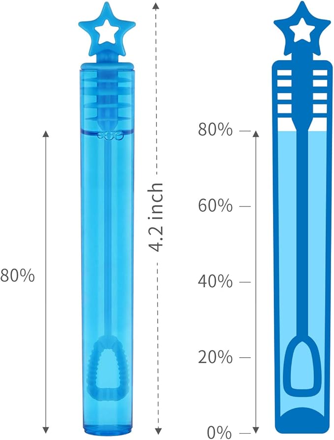 - Decent Size for everyone: It's hard to imagine that a 4-inch tube can provide so much joy.Not just perfect for little hands, but fits everyone. Each wand contains a 2 oz bubble solution and it can provide 30mins playtime, Not too much bubble liquid to clean up when kids drop the container. Not as messy as the traditional bubbles.Easy to use, refillable, very useful, and practical.