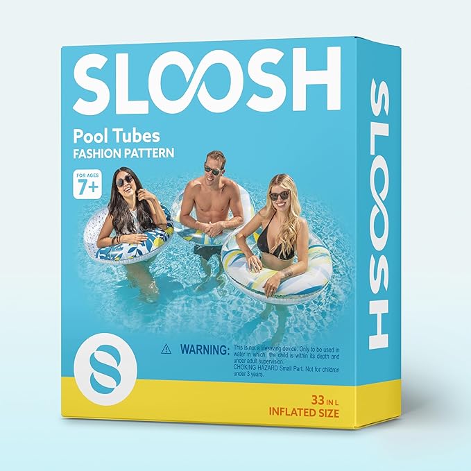 - SUPER VALUE PACK. Our stylish pool float has 3 packs that feature a unique design. Each tube has a half-transparent top piece with glitters, and patterns printed inside. Measuring 32.5”, perfect for a pool party.