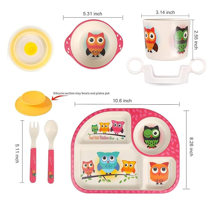 - Complete Dishware set - This kids tableware set contains 1 plate, 1 bowl, 1 cup, 1 cup holder, 1 spoon, 1 fork, 1 silicone suction.