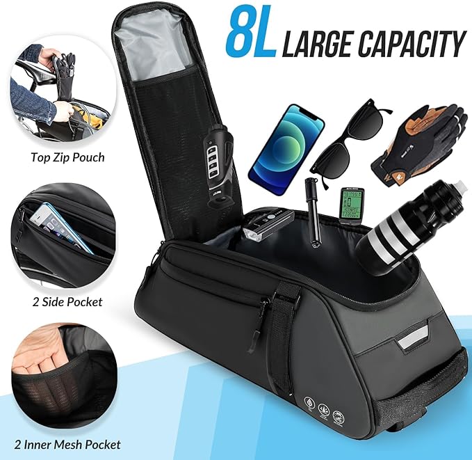 WOTOW Reflective Rear Rack Bag, Water Resistant Bike Saddle Panniers for Bicycles Ebike, 8L Trunk Cycling Back Seat Cargo Carrier Storage Pouch With Shoulder Strap for Travel Commute