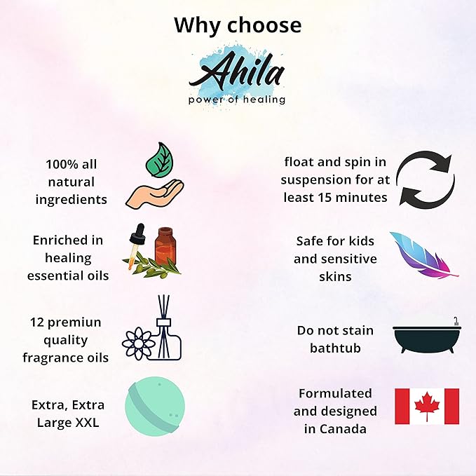 - Bunch of Goodness! Our Ahila power of healing handmade organic bathbombs are made with 100 percent all natural and safe ingredients for sensitive skin. Our Vegan bubble bombs are cruelty free, dairy free, and safe for kids! Our fizzy fun bath bombs are designed and formulated in Canada with unique designs, colors, and scents. Each bath ball is individually wrapped and packed for the best quality experience in a highly sterilized environment.
