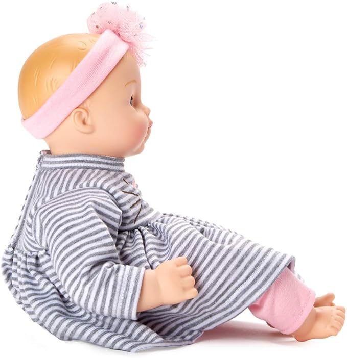 - Details: Wears a charming striped dress with kitty embroidery, pink leggings and headband; This doll features light skin tone, blue eyes, soft body, and molded arms and legs perfect for imaginative play