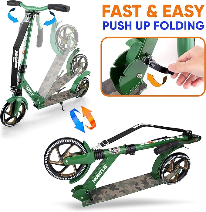 - CAMOUFLAGE FOLDING KICK SCOOTER FOR TEENS AND ADULTS – Cruise along in style on our compact kick scooter! Featuring smooth gliding wheels for maximum shock absorption and a lightweight alloy deck