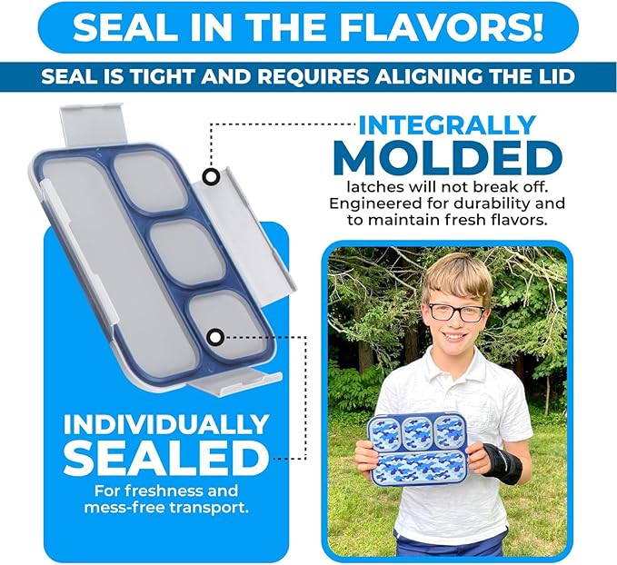 - KIDS AND ADULTS LOVE KINSHO for the individually sealed compartments that keeps food from touching. The modern grid design and clean white container bottom makes all food look tasty. Designed with a slim depth, the lid will be an air-tight fit to keep food fresh and not jostle around but is NOT recommended for liquid, soup, juice, etc.